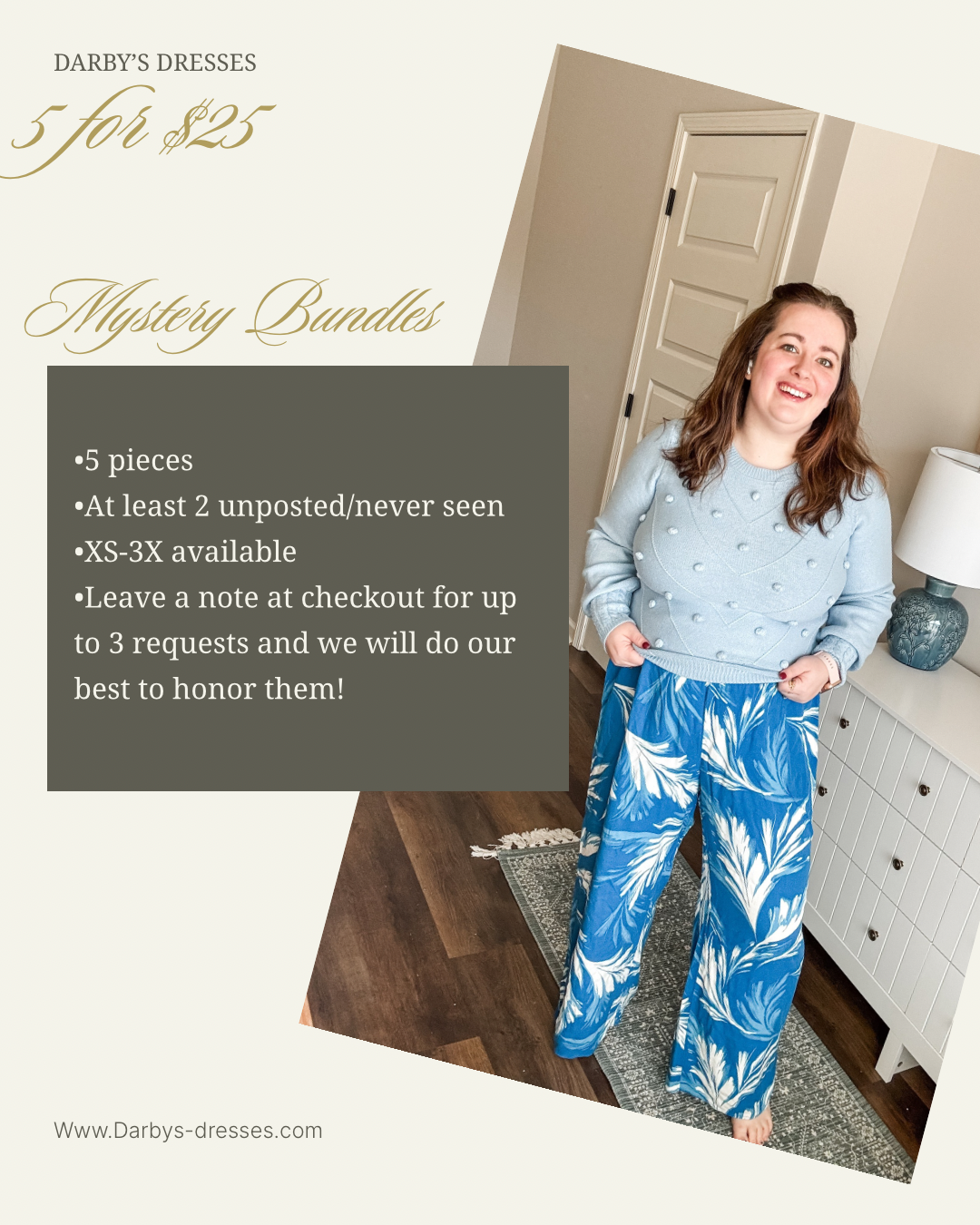 •Please leave up to 3 requests when you checkout in the Note section and we will do our best to honor them! The more broad and less specific the better, aka we likely can’t honor requests like “Only purple cotton dresses” 😆 But something like “No skirts, no orange, I like bright colors” would be easily doable!